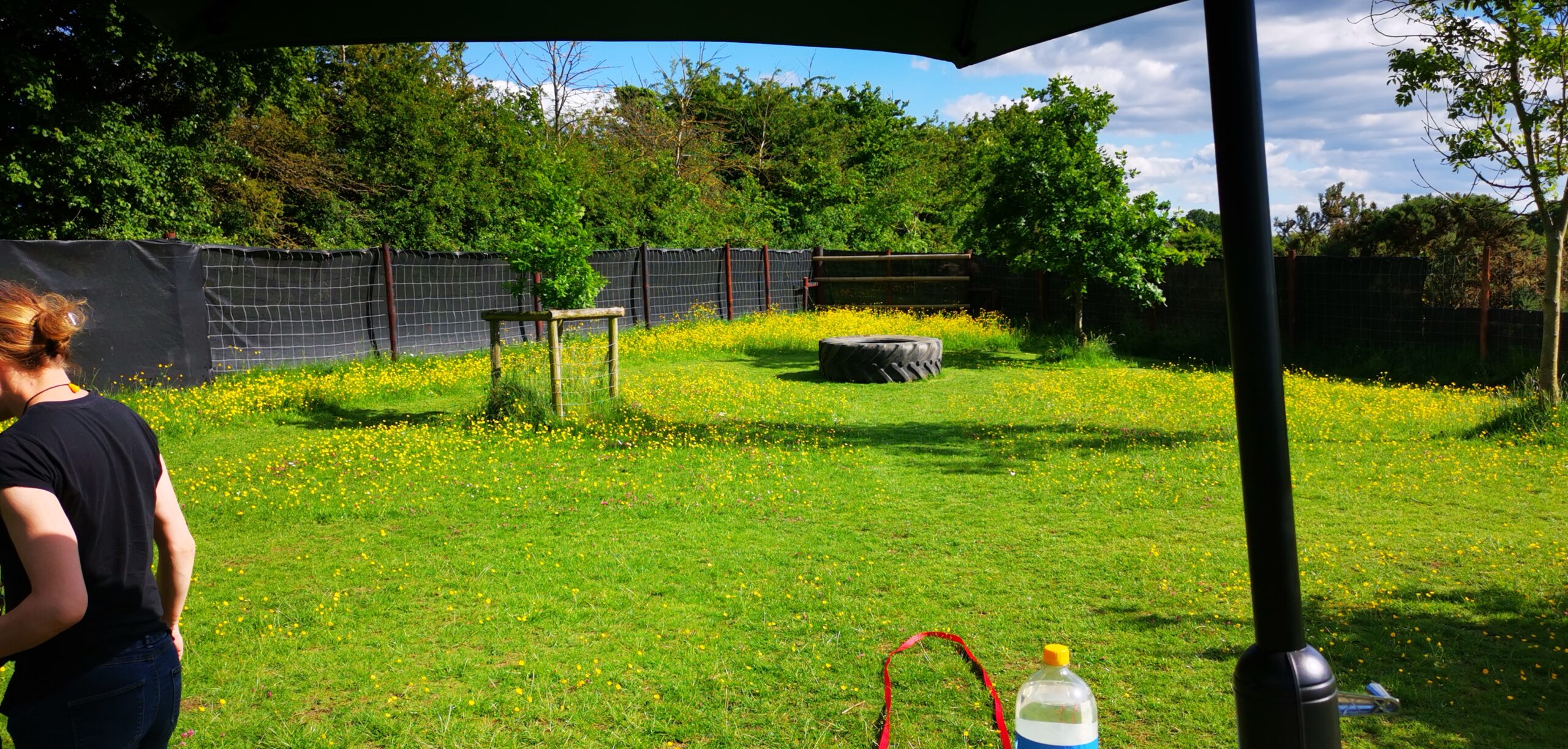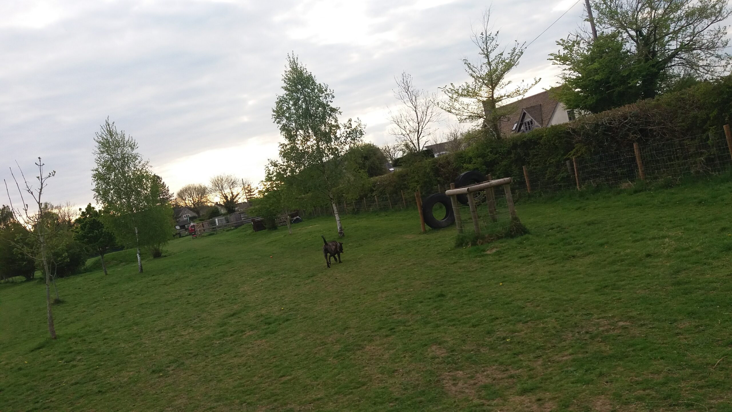 Wonderful dog running space, fully enclosed, Picnic table, shed to get into should you have rain. Fully recommend.